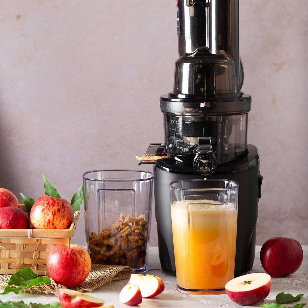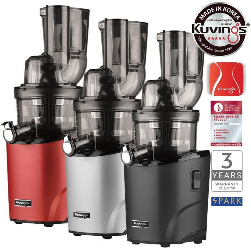 Máy ép trái cây tốc độ chậm hiệu Kuvings tự động cắt và ép trái cây cho lượng nước ép nhiều gấp 2 lần, giữ được nhiều Vitamin, Enzym trong rau củ quả gấp 5 lần so với máy truyền thống, hoạt động liên tục 30 phút, chế độ tự động ngắt điện an toàn và khóa an toàn kép thế hệ mới, ép được các loại rau, củ, quả và ngũ cốc với nhau, thiết kế dao ép thế hệ mới nhất vừa cắt vừa ép, ống tiếp nguyên liệu thế hệ mới 2 miệng ép chuyên biệt: 1 miệng ép 2 in 1 O Type Flap Gate rộng đến 90mm phù hợp để ép nguyên trái các loại trái cây & ngũ cốc và 1 miệng ép rộng đến 43mm để ép rau lá, cần tây và cà rốt mà không cần cắt nhỏ, thuận tiện sử dụng cho gia đình và nhà hàng, tích hợp phần mềm “Kuvings HealthFriend Global” cung cấp các công thức nước ép, sinh tố… và các bài tập thể dục phù hợp cho quá trình cân bằng, duy trì cơ thể hay giảm cân, có 3 màu : màu bạc, màu đỏ và màu đen carbon.
