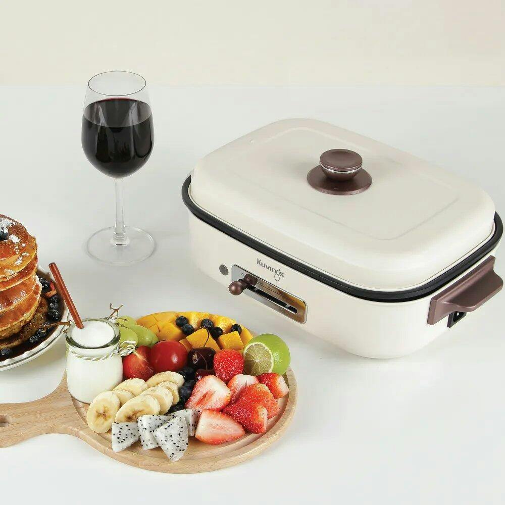 Lẩu nướng điện Kuvings 2 trong 1 với các lồng có thể tháo rời và các rãnh thoát dầu giúp việc nấu nướng và vệ sinh trở nên dễ dàng hơn bằng cách giảm bớt dầu mỡ và cho phép thay đổi lồng tiện lợi.