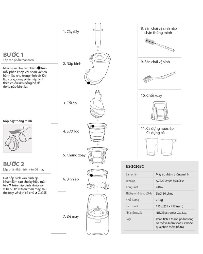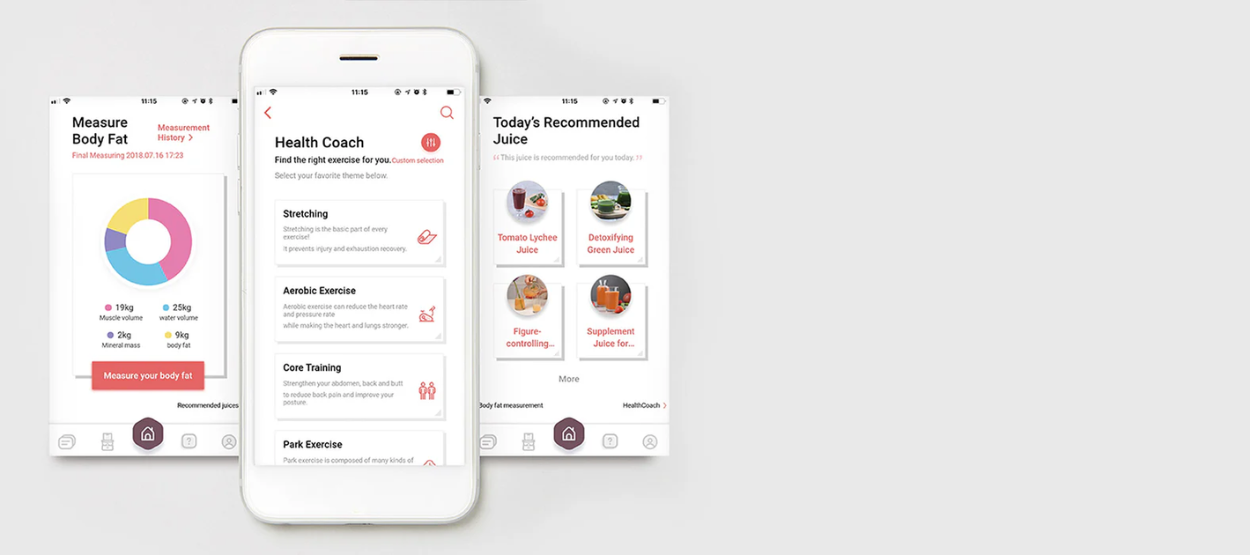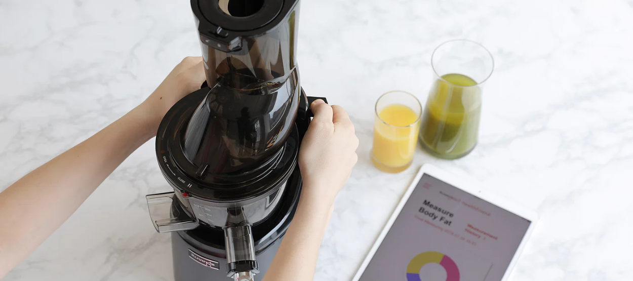 By using the body composition analyzer built into the juicer, you can measure 7 types of body composition (body fat mass, body fat percentage, muscle mass, body water, minerals, body mass index (BMI) and basal metabolic rate (BMR)).